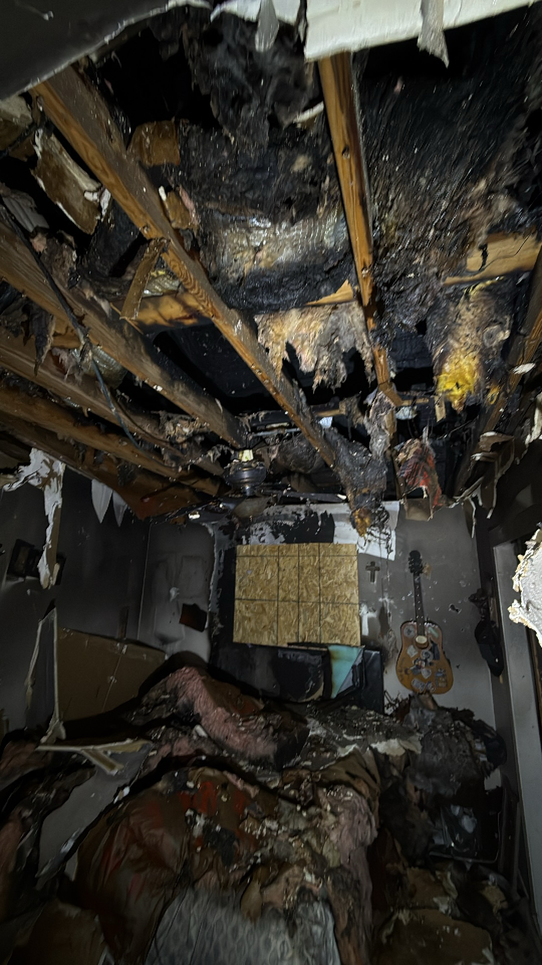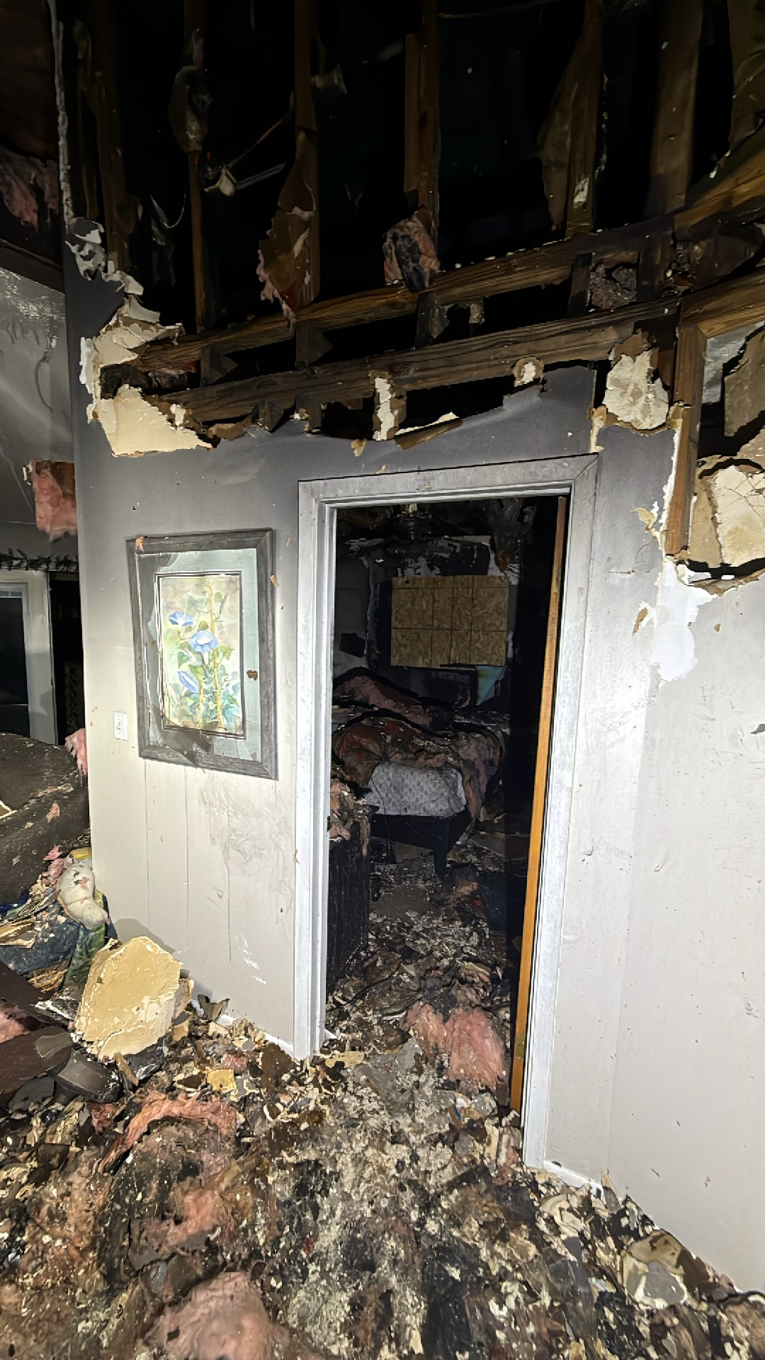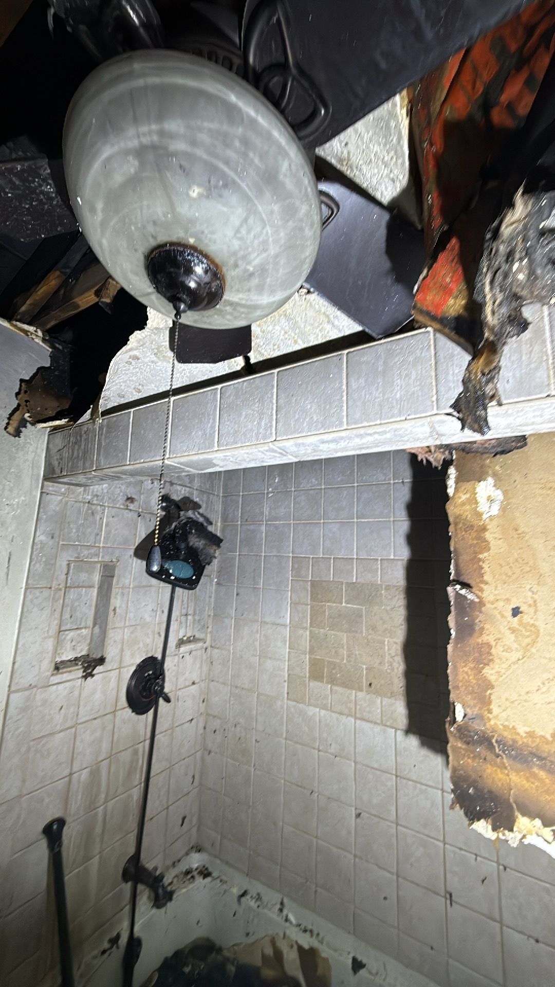 The customer experienced significant fire damage throughout their property, resulting in extensive structural destruction, charring, and debris accumulation in multiple rooms, including the bathroom.